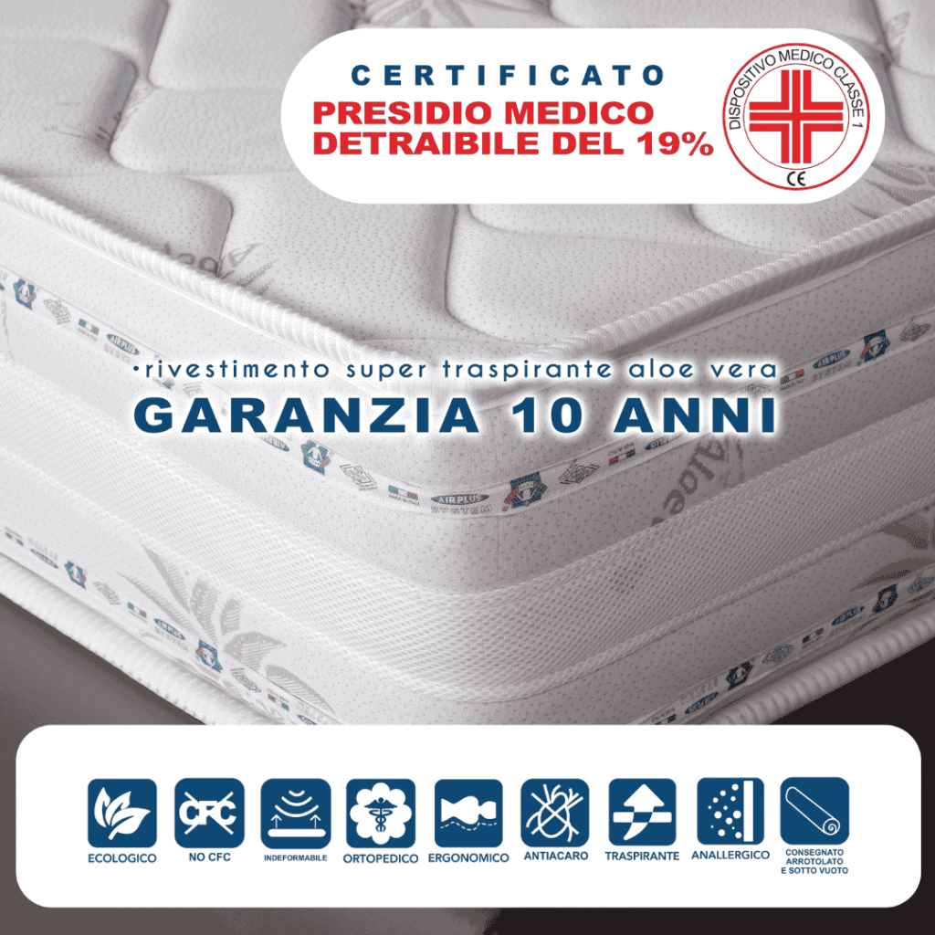 Il Materasso Elisir non è un semplice materasso: è un presidio medico certificato, studiato per offrirti il massimo sostegno e migliorare la qualità del tuo riposo. Con la garanzia di 10 anni hai la certezza di un prodotto sicuro e duraturo, realizzato per accompagnarti a lungo nel tuo benessere quotidiano. E per dormire davvero senza pensieri, hai a disposizione la prova di 10 notti: lo usi, lo testi e, se non ti convince, puoi restituirlo senza rischi.